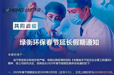 尊敬的客戶:新型肺炎防疫形勢(shì)嚴(yán)峻,結(jié)合國(guó)家防控要求,綠衡環(huán)保經(jīng)研究決定春節(jié)假期延至2月9日,2月10日正式開工。全心全意為您服務(wù),共渡難關(guān)再創(chuàng)輝煌。